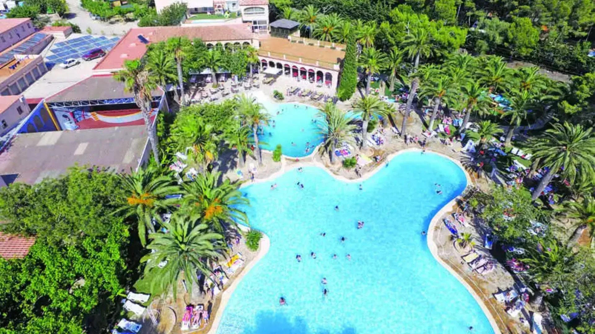 With bright blue pools tucked behind lush citrus and olive trees, this holiday park looks more like a tropical island.