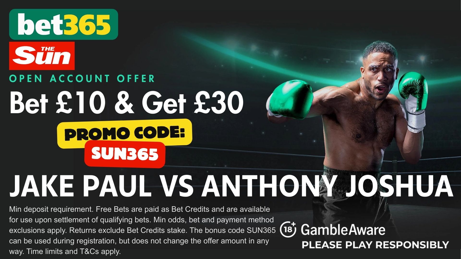You can back the British giant—or the YouTuber-turned-pro—with a 300% welcome offer using the bet365 bonus code SUN365.