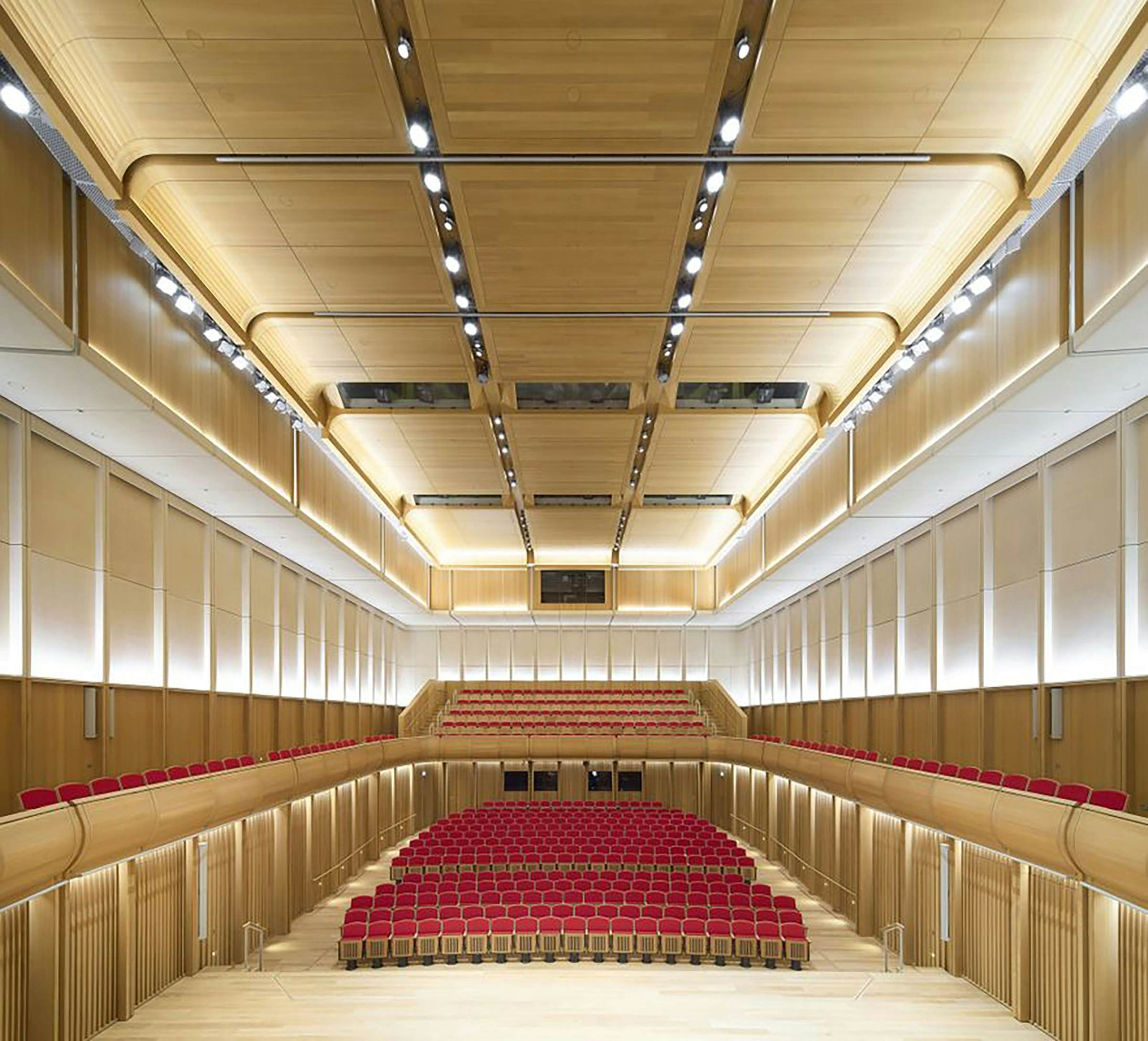 In the basement are a big, beautifully designed 500-seat concert hall, a 250-seat small theatre for daytime lectures and student drama, and a 100-seat experimental black box laboratory.