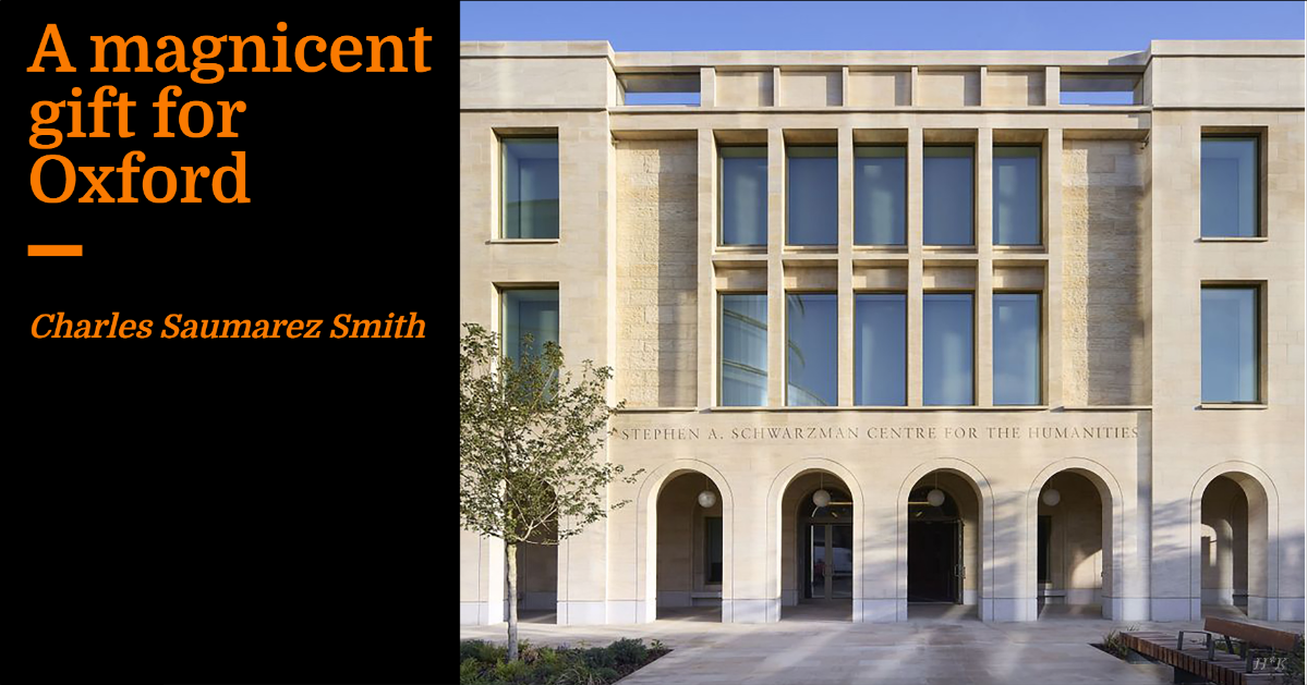 Then, in 2018, Oxford announced a gift of £150 million from Stephen Schwarzman, the founder of Blackstone, who had visited Oxford as a 15-year old on his first tour abroad. He had been impressed.