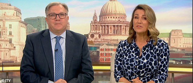 He said: ‘So it’s…’ before going blank and staring directly down the camera, causing Susanna to jump in and add: ‘It’s 8.53, you’re watching Good Morning Britain. See you in a moment’. The show then cut to a commercial break.