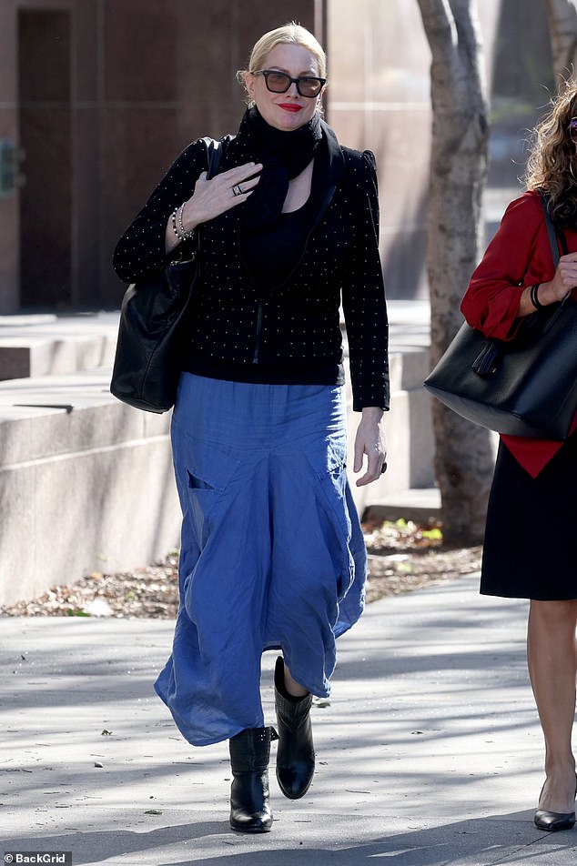 The British-American actress, 57, wore a black polka-dot blouse and a flowing blue skirt for the final day of proceedings.