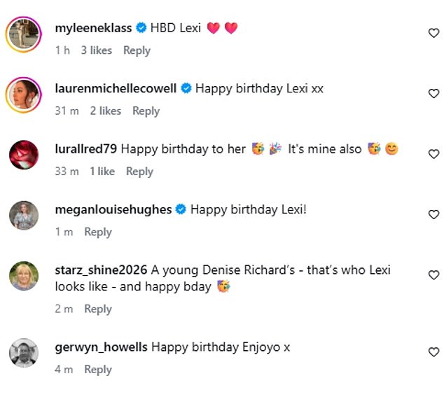 Amanda’s fans and famous pals including Claudia Winkleman and Ashley Roberts took to the comments to wish Lexi a happy birthday.