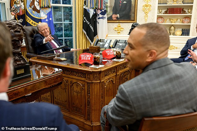 In the Oval Office, the president placed ‘Trump 2028’ hats on the Resolute Desk directly in front of the Democratic leaders beside a pair of ice-cold Diet Cokes, his favorite drink.