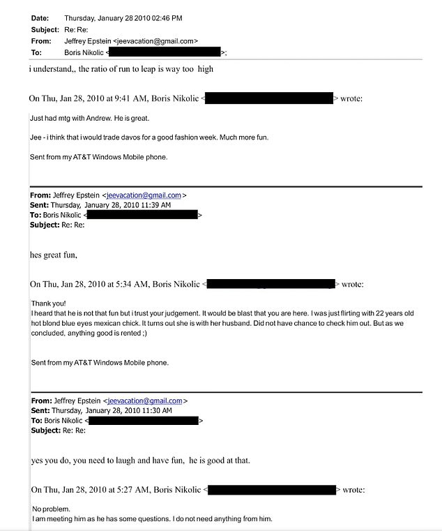 And after meeting with Andrew, Nikolic reported back to Epstein, writing: ‘He is great… I think I would trade Davos for a good fashion week. Much more fun.’