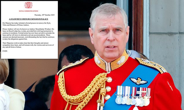 King Charles, 76, made the bombshell announcement about Andrew losing his royal titles and being kicked out of Royal Lodge last night.