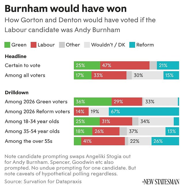 However, according to the Survation polling for Datapraxis, Mr Burnham would have been supported by 47 per cent of those ‘certain’ to vote.