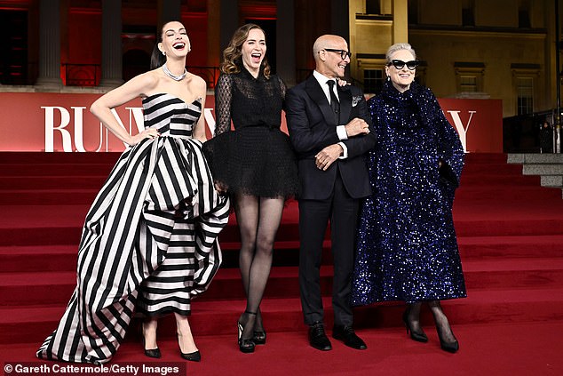 Leading the stars were leading ladies Anne Hathaway and Emily Blunt, who couldn’t contain their laughter as they posed with Meryl Streep and Stanley Tucci.
