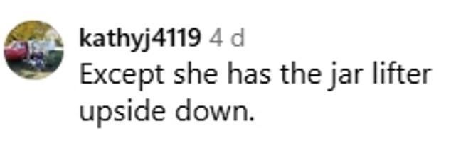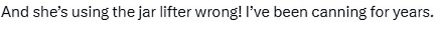 One experienced jam maker said: ‘She’s using the jar lifter wrong! I’ve been canning for years.’