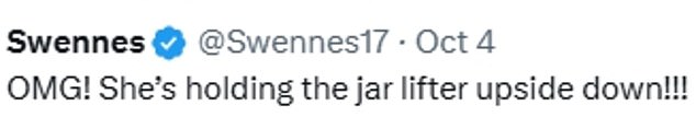 Fans wrote online: ‘OMG! She’s holding the jar lifter upside down!!!’;