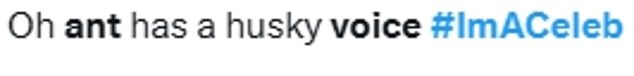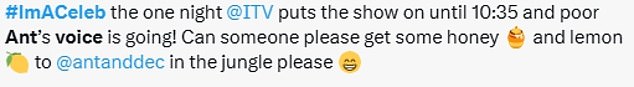 ‘poor Ant’s voice is going! Can someone please get some honey and lemon to in the jungle please.’