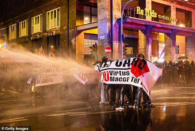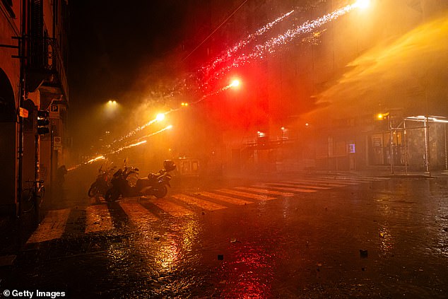 Footage from Friday’s chaos shows protesters launching rockets at Italian cops, while police fired gas and used water cannons to disperse the crowds.