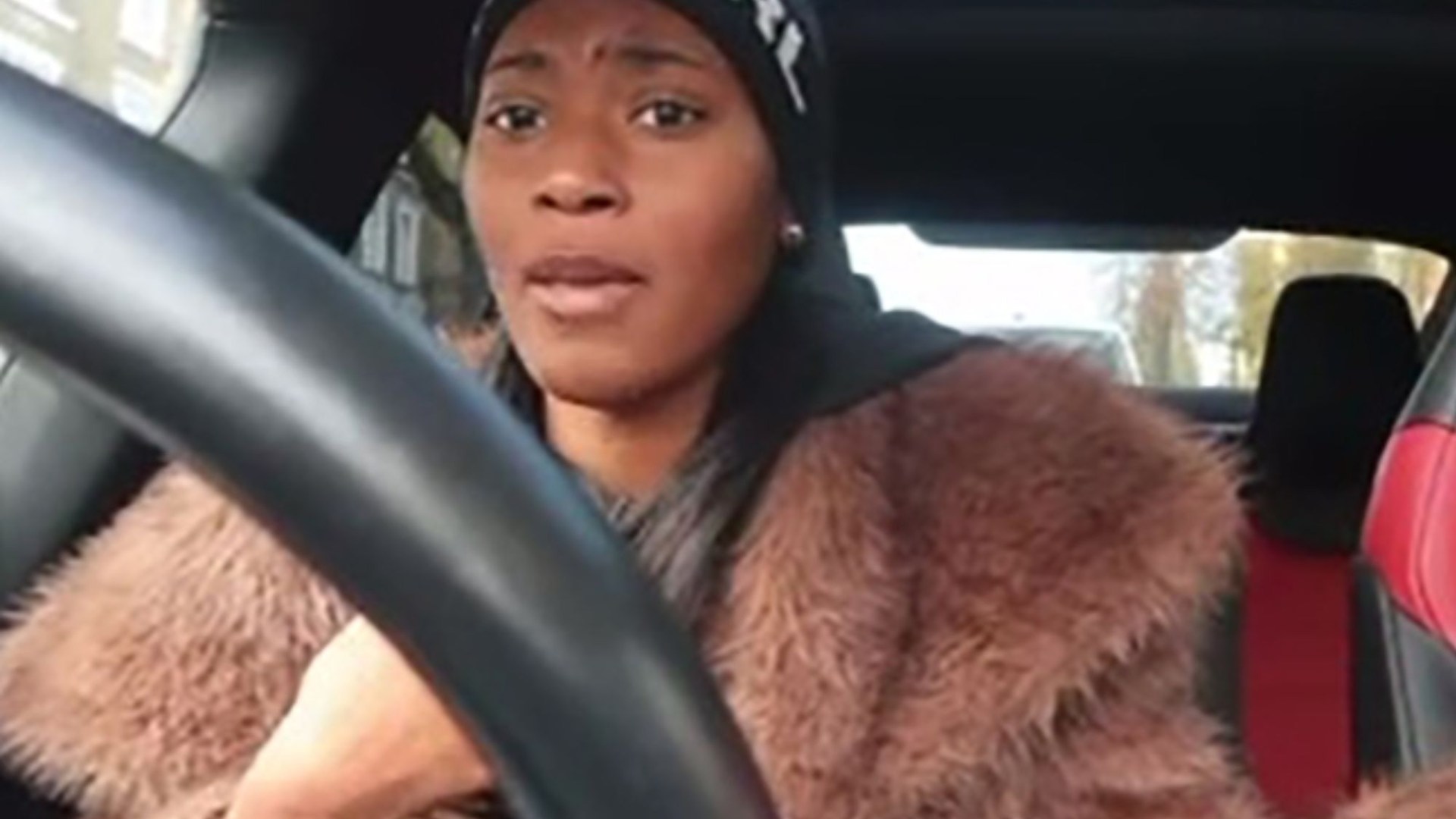 In one video she has a near crash and says: “I nearly hit my rims” and in another she shows off an unopened alcoholic drink she plans to have later.