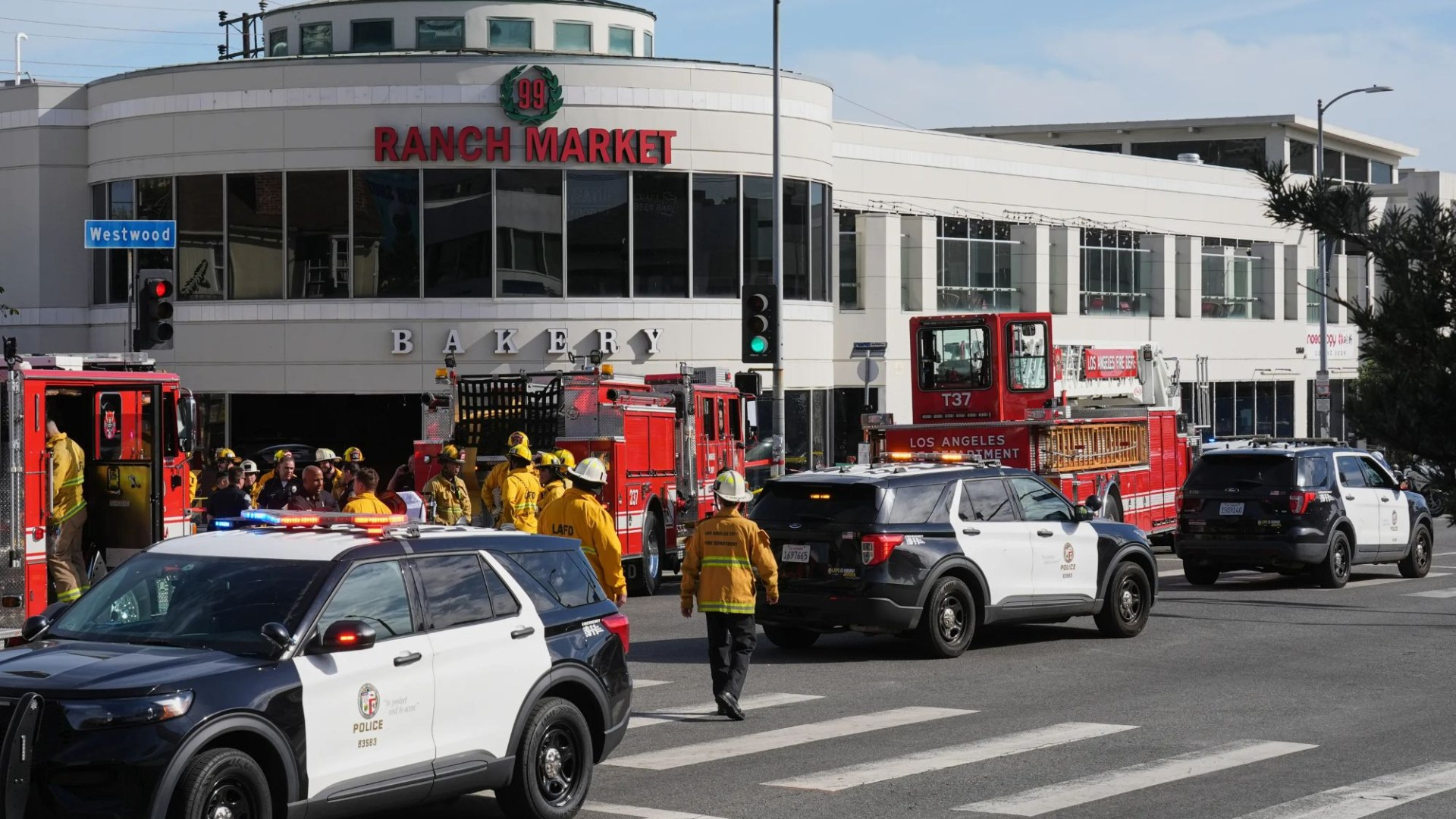 An image collage containing 1 images, Image 1 shows First responders, including firefighters and police officers, work at the scene of a fatal crash outside a 99 Ranch Market in Los Angeles