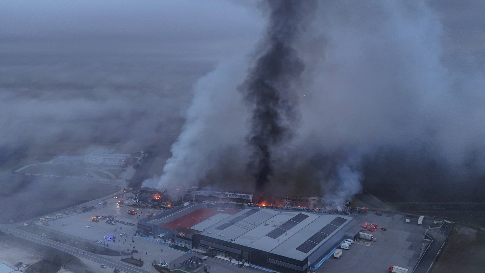 Thick black smoke billowed into the sky as around 40 firefighters and 13 trucks tackled the fire engulfing the industrial facility, with flames still visible across the roof of the complex.