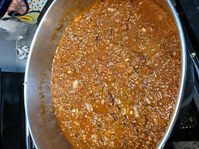 Get them all happy happy, working everything by moving them around every couple of minutes, plus keep breaking up those last chinks of meat that might have formed. You want the hamburger to be thoroughly cooked, almost to the point of being browned, and the onions will have become transparent, letting you know they’re done as well.