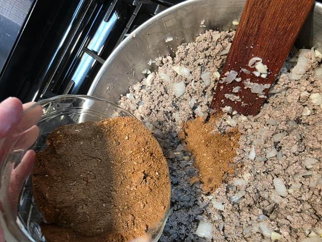 Now, the kitchen probably smells like a million bucks, but that ain’t nuthin’ yet. Take your little bowl of mixed up aromatics, and dump it over the meat mixture. Stir everything thoroughly together so that the heat will hit every last one of those spices. It will bloom the natural oils in them.