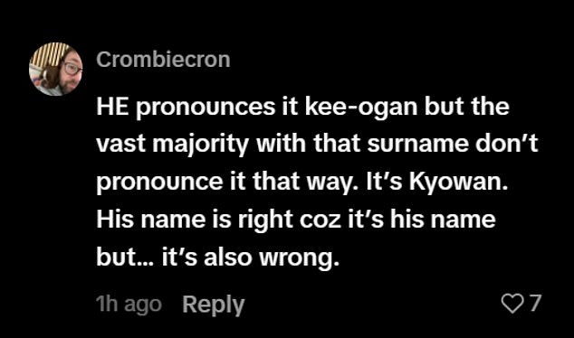 ‘HE pronounces it kee-ogan but the vast majority with that surname don’t pronounce it that way. It’s Kyowan. His name is right coz it’s his name but… it’s also wrong.’