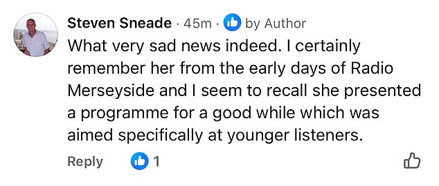 ‘What very sad news indeed. I remember her from the early days of Radio Merseyside and I send to recall she presented a programme for a good while which was aimed specifically at younger audiences.’