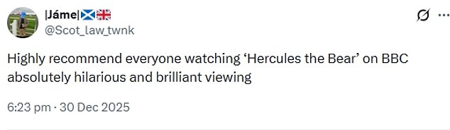 They wrote: ‘Highly recommend everyone watching ‘Hercules the Bear’ on BBC absolutely hilarious and brilliant viewing’;