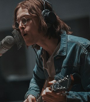 Hysterical fans, frantic photographers, police cordons and plenty of period flourishes were on display as filming commenced on Sunday (pictured: Harris Dickinson as John Lennon)