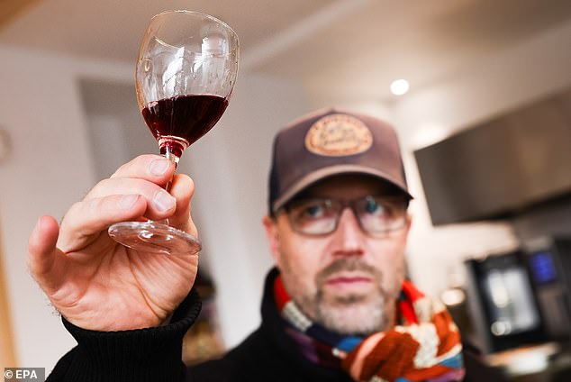 A man smells a glass of Beaujolais at a grocery store in Montreuil, Paris on Thursday