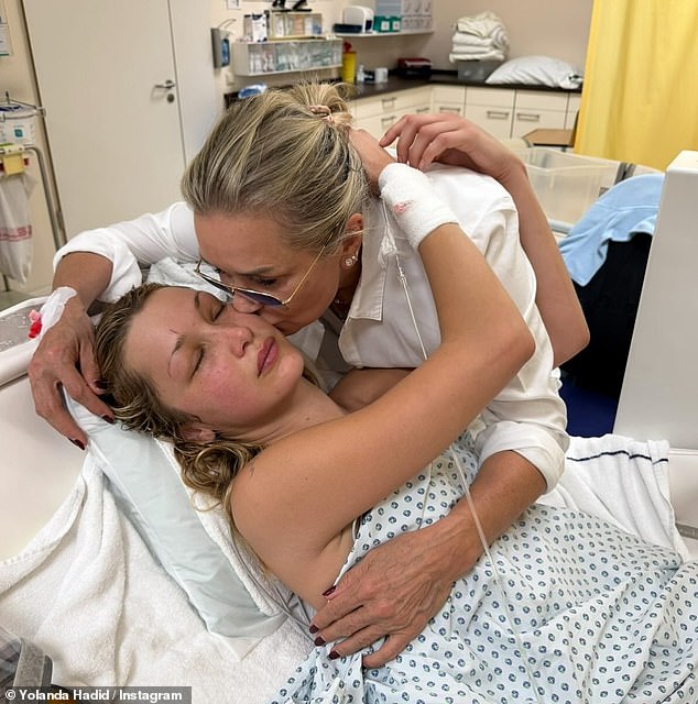 The alarming images – which were shared by both Hadid and her mother Yolanda, who also suffers from chronic Lyme disease – showed the model hooked up to an IV, breathing through an oxygen tube and covered in wet towels.