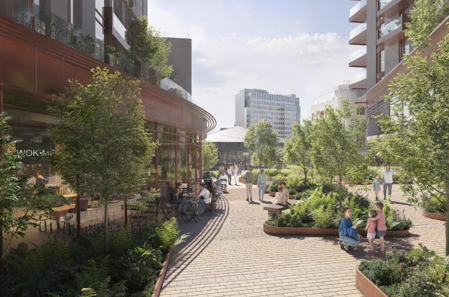 The new buildings, which reach up to 16 storeys in height, will include 500 apartments, commercial units, and an NHS health facility.