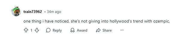 One said on Reddit: ‘One thing I have noticed, she’s not giving into Hollywood’s trend with Ozempic…’