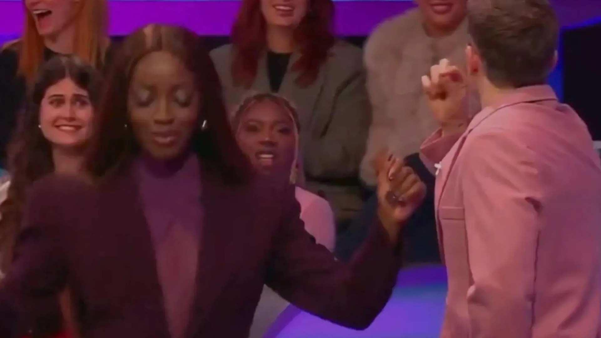 AJ was seen dancing along to chants of “get Caroline out” from the show’s live audience, before quickly stopping.