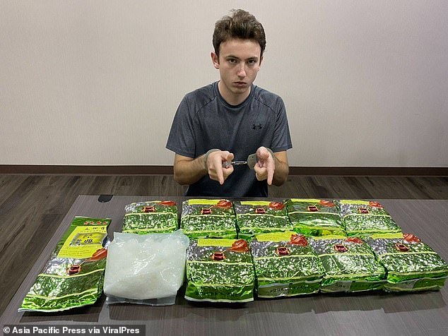 George Wilson, 23, from High Wycombe, Buckinghamshire, (pictured) is said to have received 9.15kg of methamphetamine from another Briton at a hotel in the red-light area of Bangkok on Monday evening
