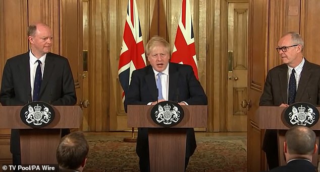 Boris Johnson as Prime Minister with chief medical officer Chris Whitty, left, and chief scientific adviser Sir Patrick Vallance, right, in March 2020