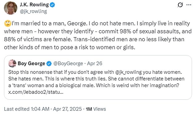 George had previously accused Rowling of hating men, having previously claimed she could not tell the difference between a transgender woman and a biological man.