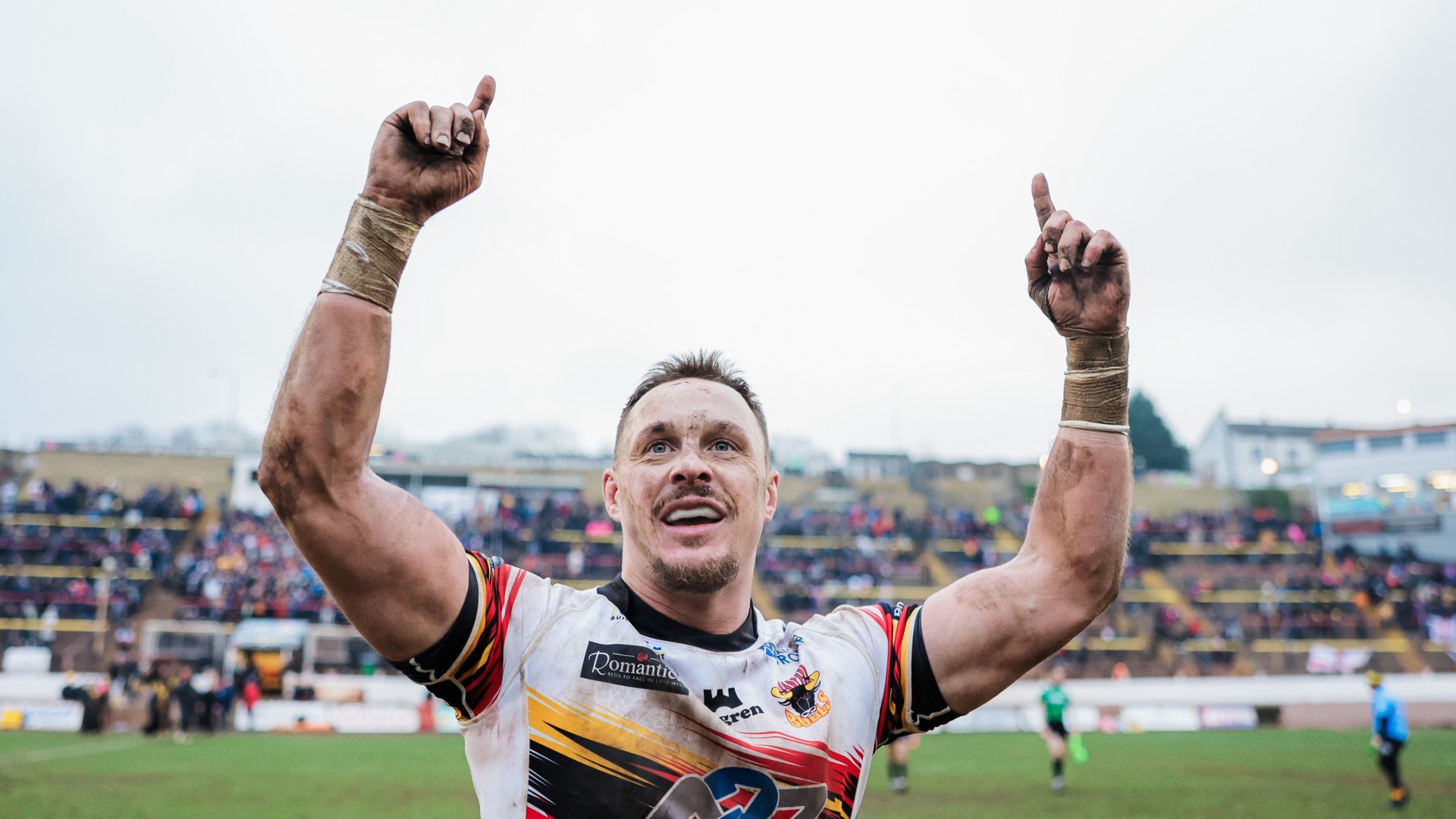 A rugby player from Bradford Bulls, wearing a Betfred Challenge Cup medal, pumps his fist.