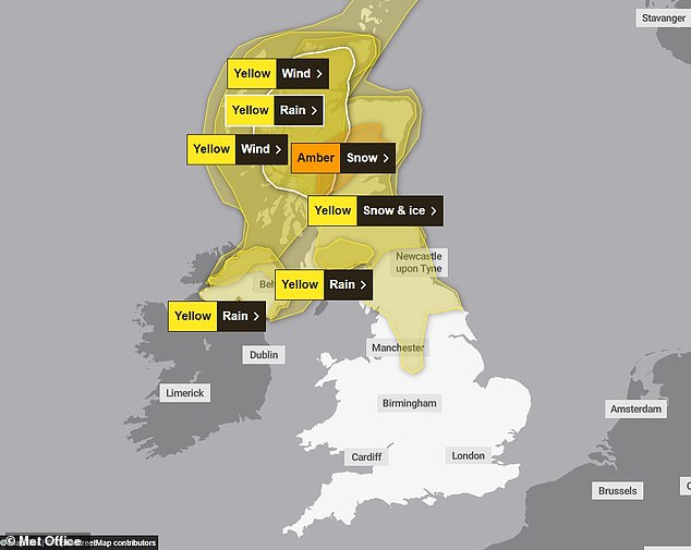 Elsewhere, a series of yellow warnings for snow, wind and rain cover much of the rest of the UK, with National Rail warning of disruption across England, Wales and Scotland through the weekend.