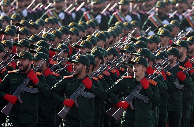The Iranian Revolutionary Guard Corps (IRGC) has led a deadly crackdown on anti-government protesters. Pictured are soldiers at a rally in 2024