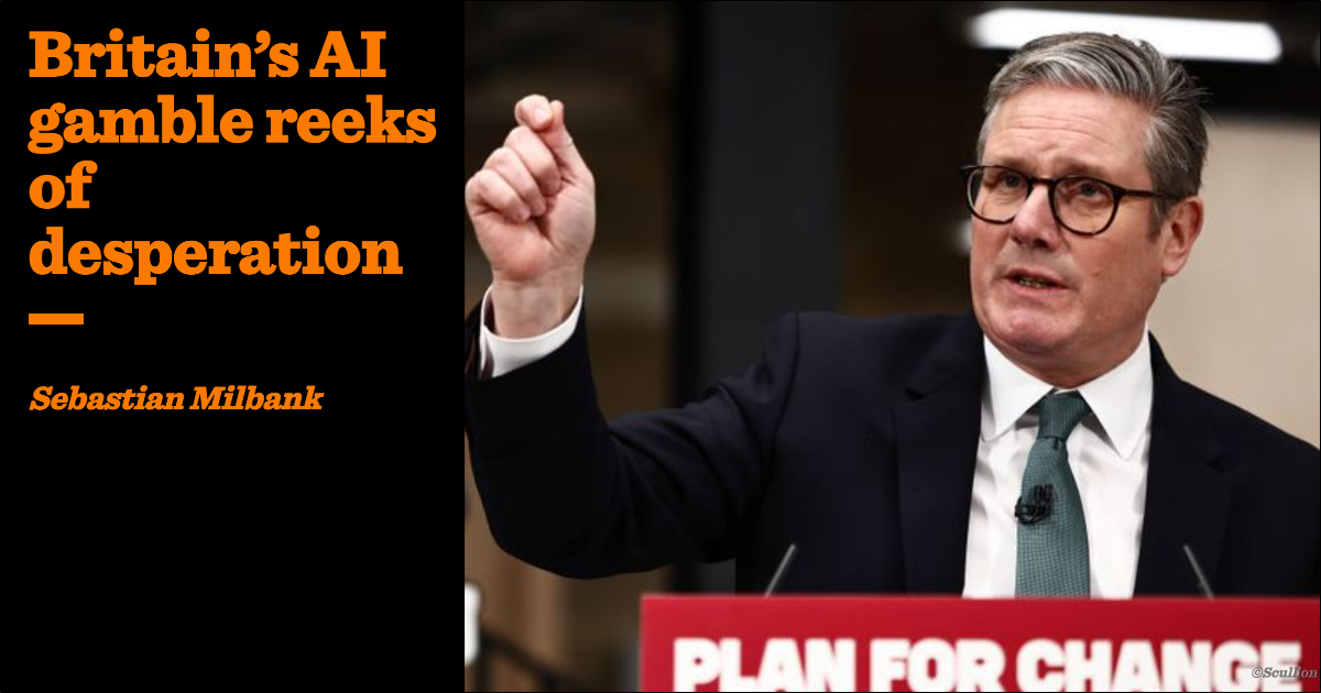 Nor is this primarily benefiting a domestic British industry — the AI industry is concentrated in America, and Britain’s most successful AI firm, DeepMind, was acquired by Google 12 years ago. Somehow, I don’t expect government plans to extend to renationalising it.