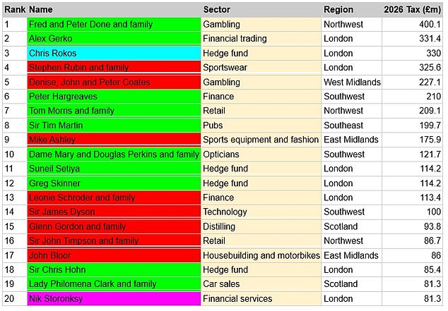 Britain’s biggest taxpayers revealed: Gambling tycoons top list with £400m tax bill, while Premier League stars join Harry Styles, JK Rowling and Anthony Joshua in the top 100