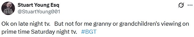‘Ok on late night tv. But not for me granny or grandchildren’s viewing on prime time Saturday night tv,’; ‘So hows that a talent? Pure stupidity,’;