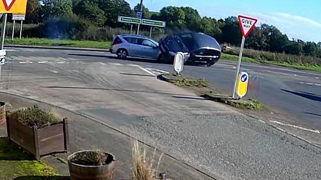 The series of clips, exclusively obtained by the Daily Mail, at the Llynclys crossroads, on the England and Wales border, show a car being spun after being hit by a lorry
