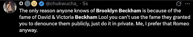 While more complained: ‘The only reason anyone knows of Brooklyn Beckham is because of the fame of David and Victoria Beckham Lool you can’t use the fame they granted you to denounce them publicly, just do it in private’.