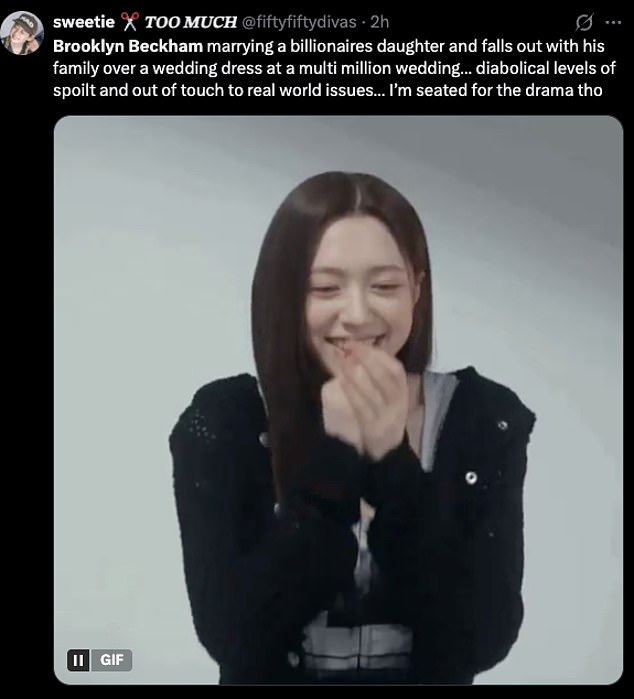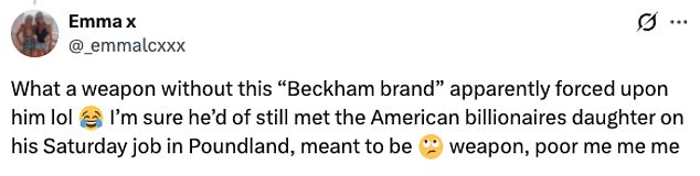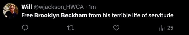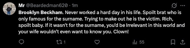 Taking to X they fumed: ‘Free Brooklyn Beckham from his terrible life of servitude’: ‘Brooklyn Beckham never worked a hard day in his life. Spoilt brat who is only famous for the surname. Trying to make out he is the victim. Rich spoilt baby. If it wasn’t for the surname, you’d be irrelevant in this world and your wife wouldn’t even want to know you. Clown!’.