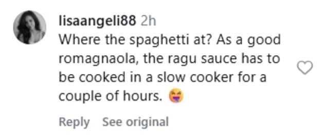 ‘Special spaghetti cause there ain’t no spaghetti in there’; ‘Where the spaghetti at? As a good romagnaola, the ragu sauce has to be cooked in a slow cooker for a couple of hours’.