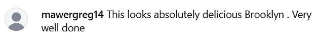 The dish caught the eye of one of Brooklyn's grandparents Jackie Adams, who is Victoria's mum, who reached out praised him: 'That looks amazing Brooklyn. Lots of love xx'