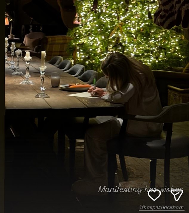 Sitting at the kitchen table of the Beckhams’ Cotswold home, 14-year-old Harper Beckham is busy putting pen to paper. Victoria, shared it with her 33million followers on Instagram, under the caption: ‘Manifesting her wishes’