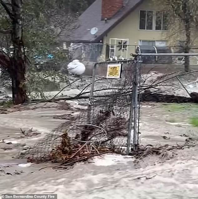 San Bernardino County firefighters said they rescued people trapped in cars Wednesday when mud and debris rushed down a road leading into Wrightwood, a resort town in the San Gabriel Mountains about 80 miles (130 kilometers) northeast of Los Angeles. It was not immediately clear how many were rescued.