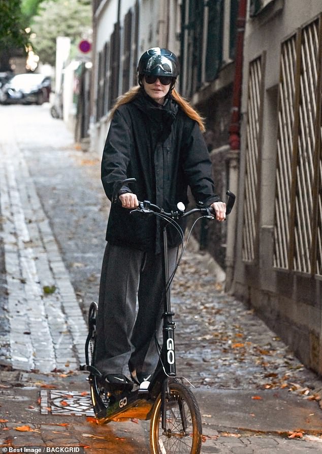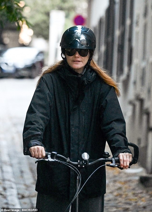 Bruni was seen wearing a black coat and a pair of oversized sunglasses as she rode along a cobbled street with a companion