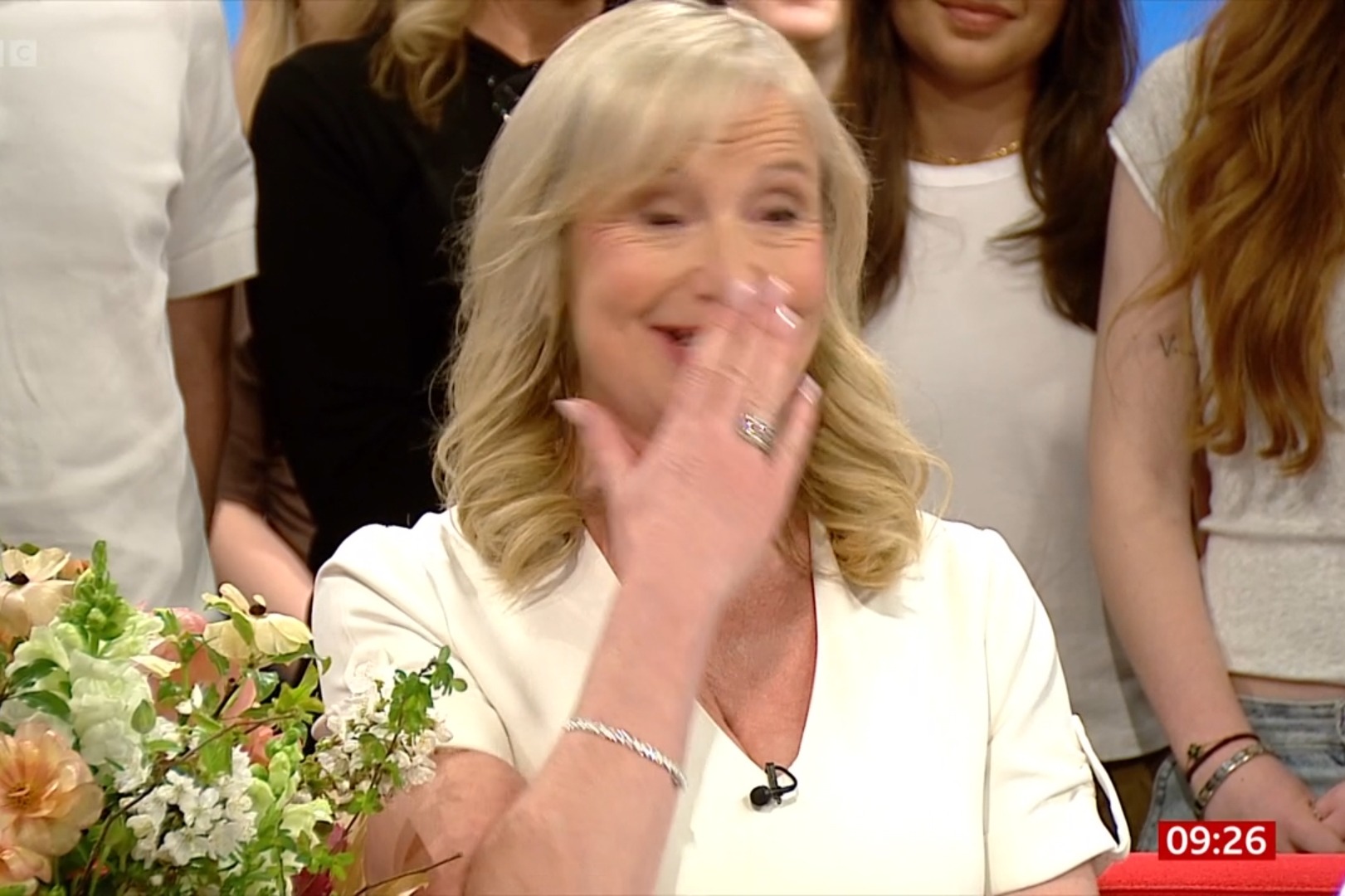 Carol’s husband Steve then surprised her in the studio with a huge bouquet of flowers.