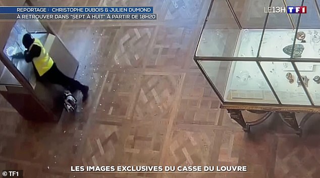 The minute-long security camera clip, shared on French TV news show Sept à Huit, captured two burglars each breaking into the glass cases before brazenly seizing their loot