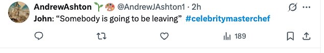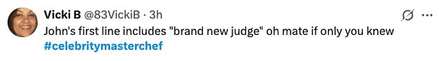 While others couldn’t help but pick up on John’s poor choice of words: “john’s first line includes “Brand New Judge” oh made if only you knew’: ‘John: “Somebody is going to be leaving”‘: ‘John: It’s #celebritymasterchef and we are back You’re not back for long fella’.